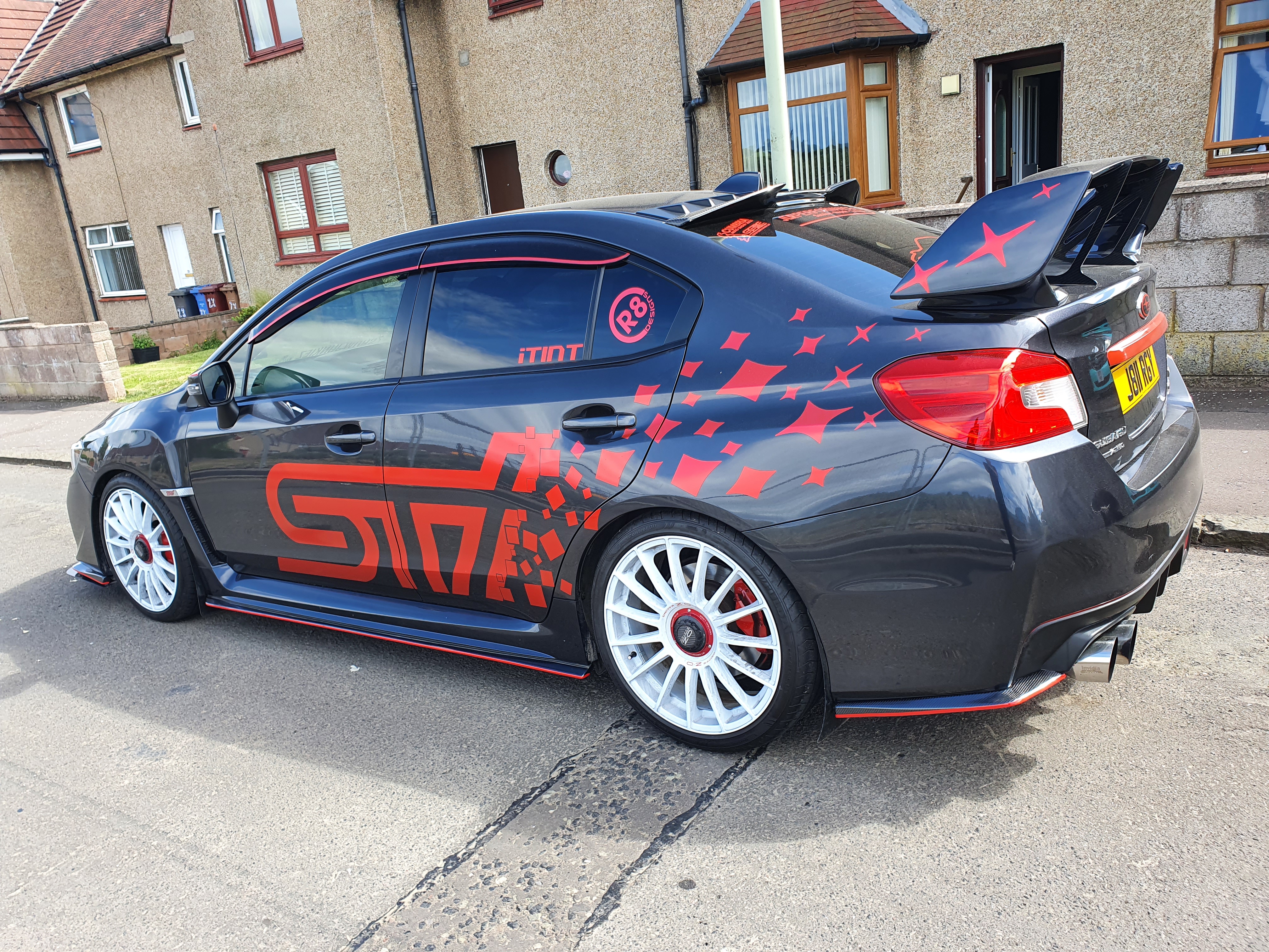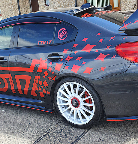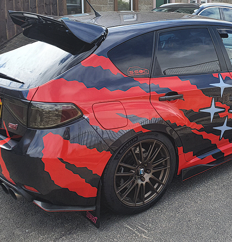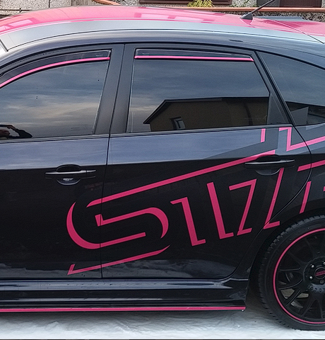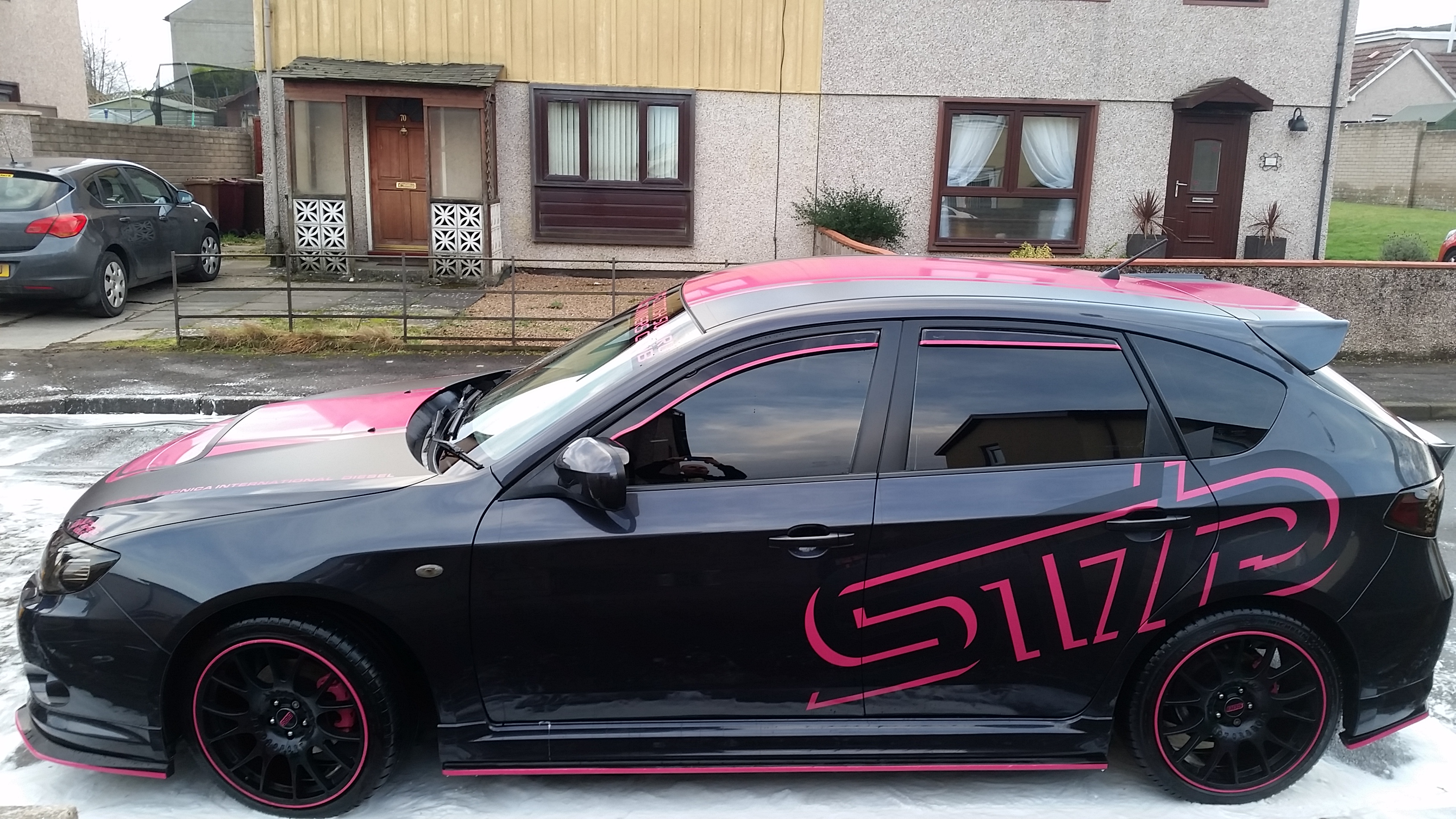 Branding, Vehicle GraphicsSubaru Impreza roof/bonnet/spoiler wrapped in satin black with gloss pink wrap overlay