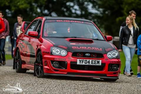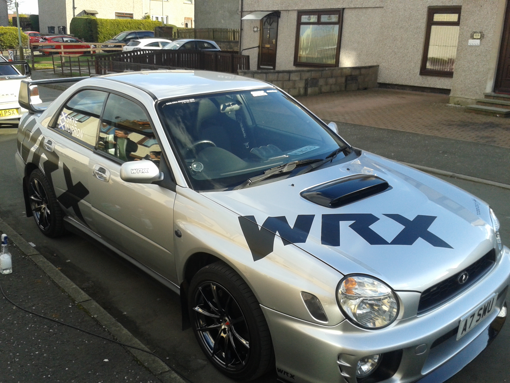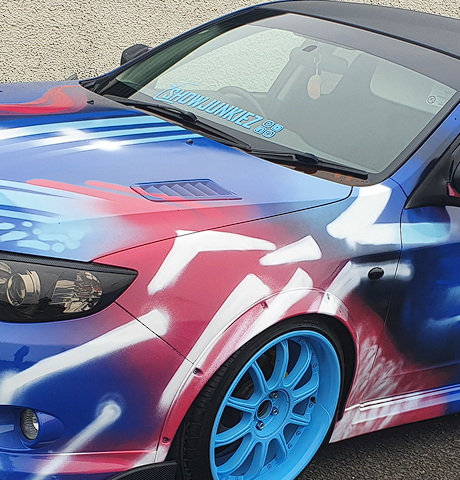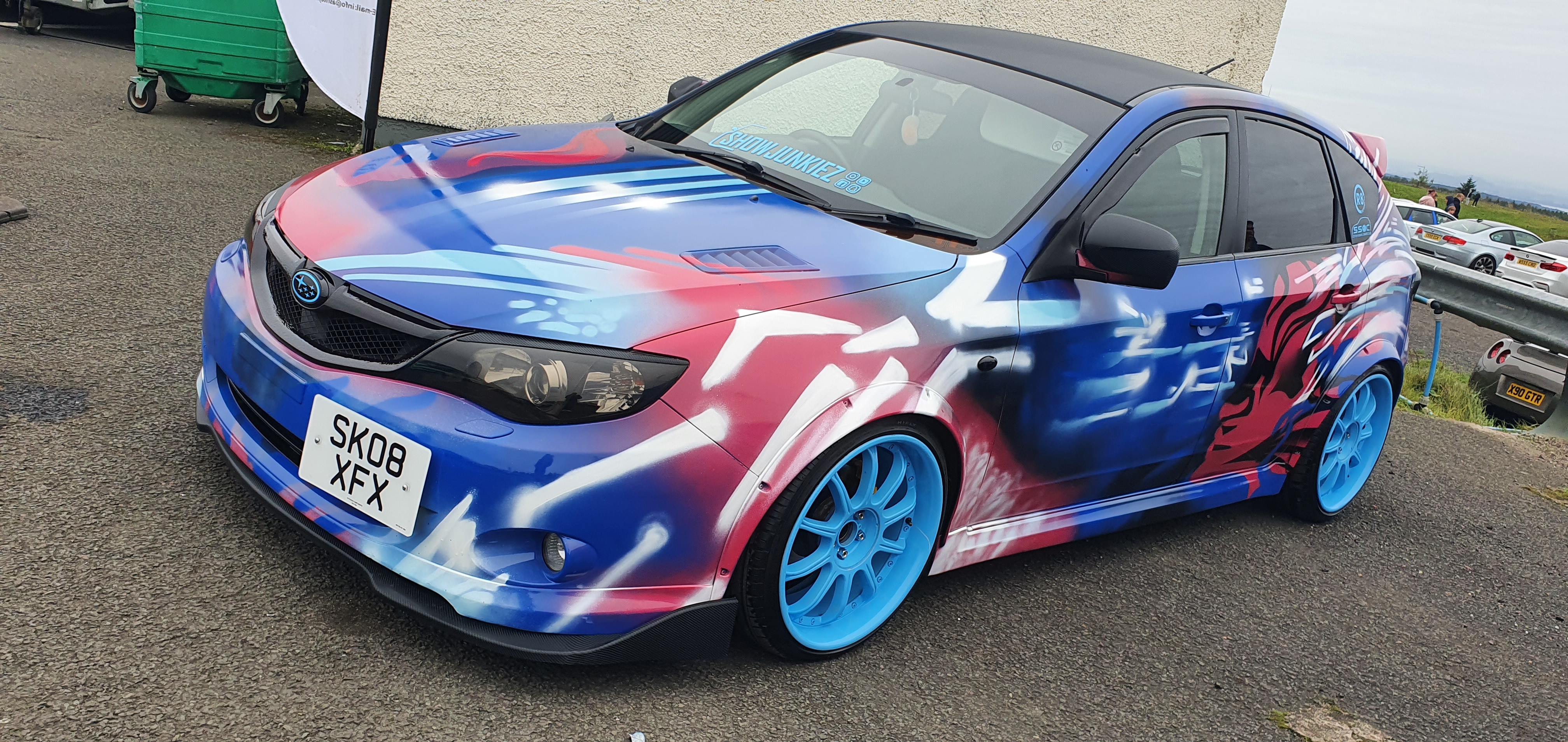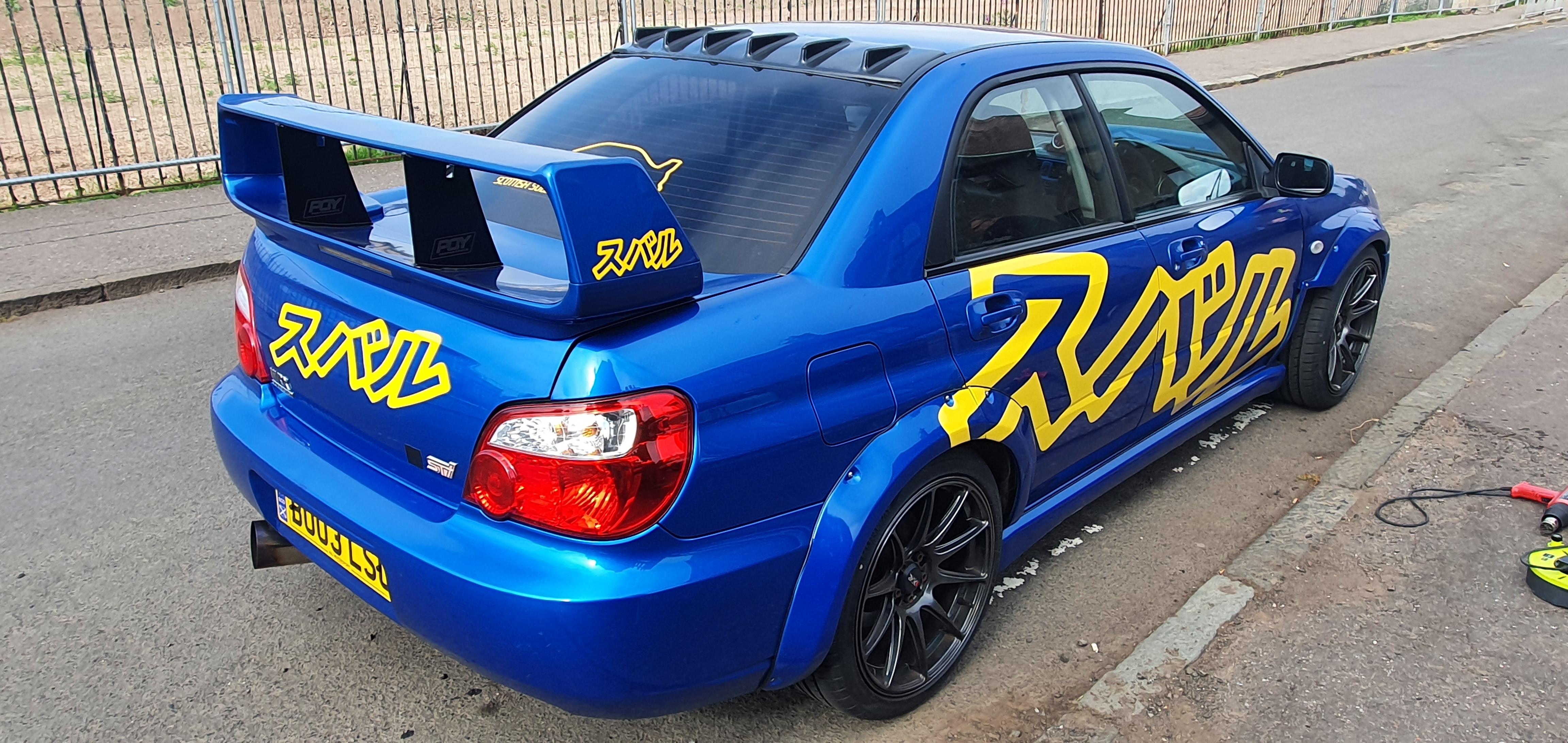 Branding, Vehicle GraphicsSubaru Impreza roof/bonnet/spoiler wrapped in satin black with gloss pink wrap overlay