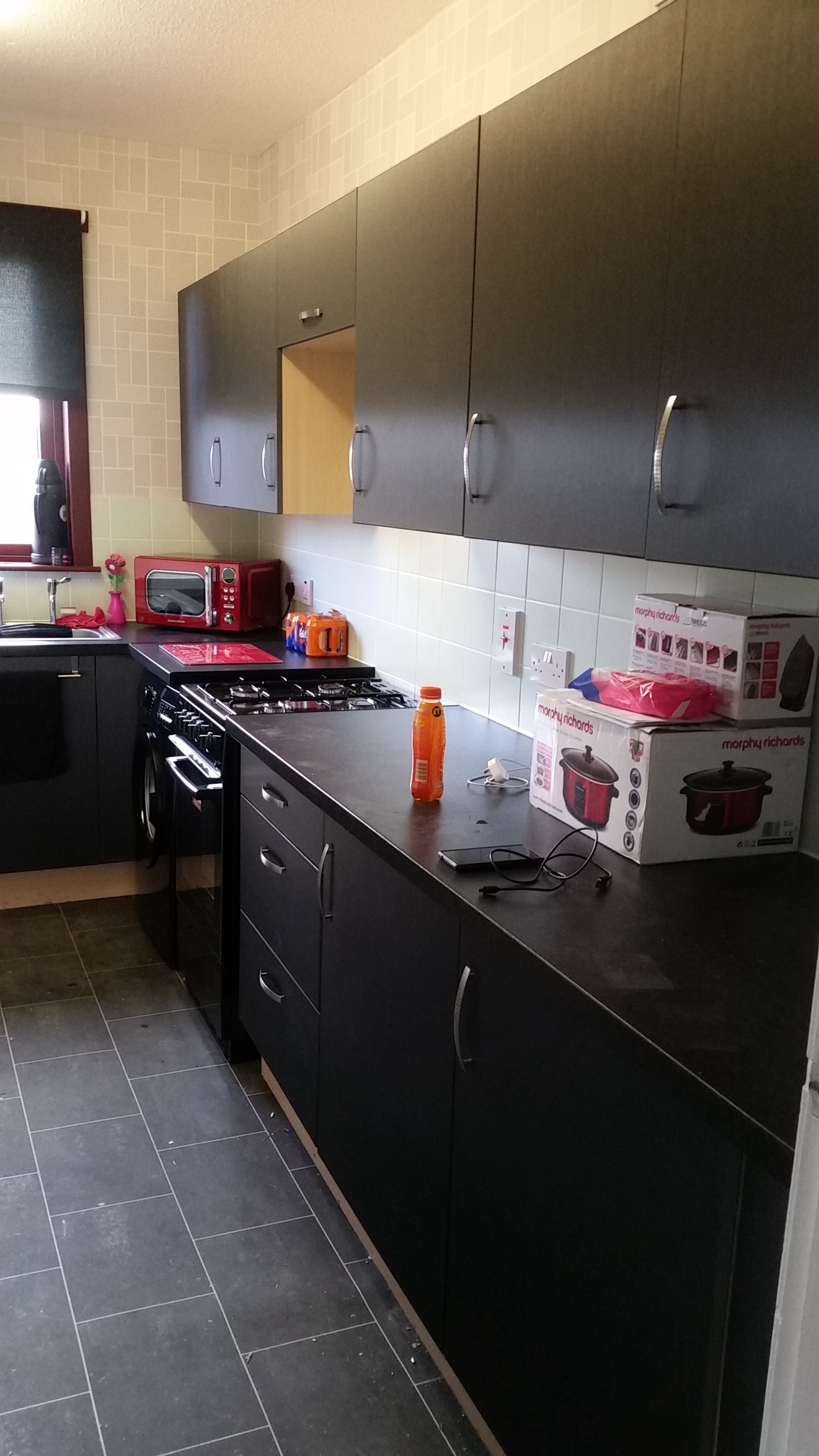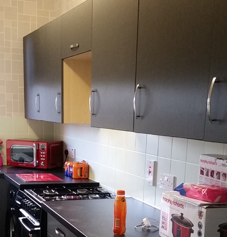 Kitchen units wrapped in Charcoal brushed aluminium, finished off with new satin chrome handles.