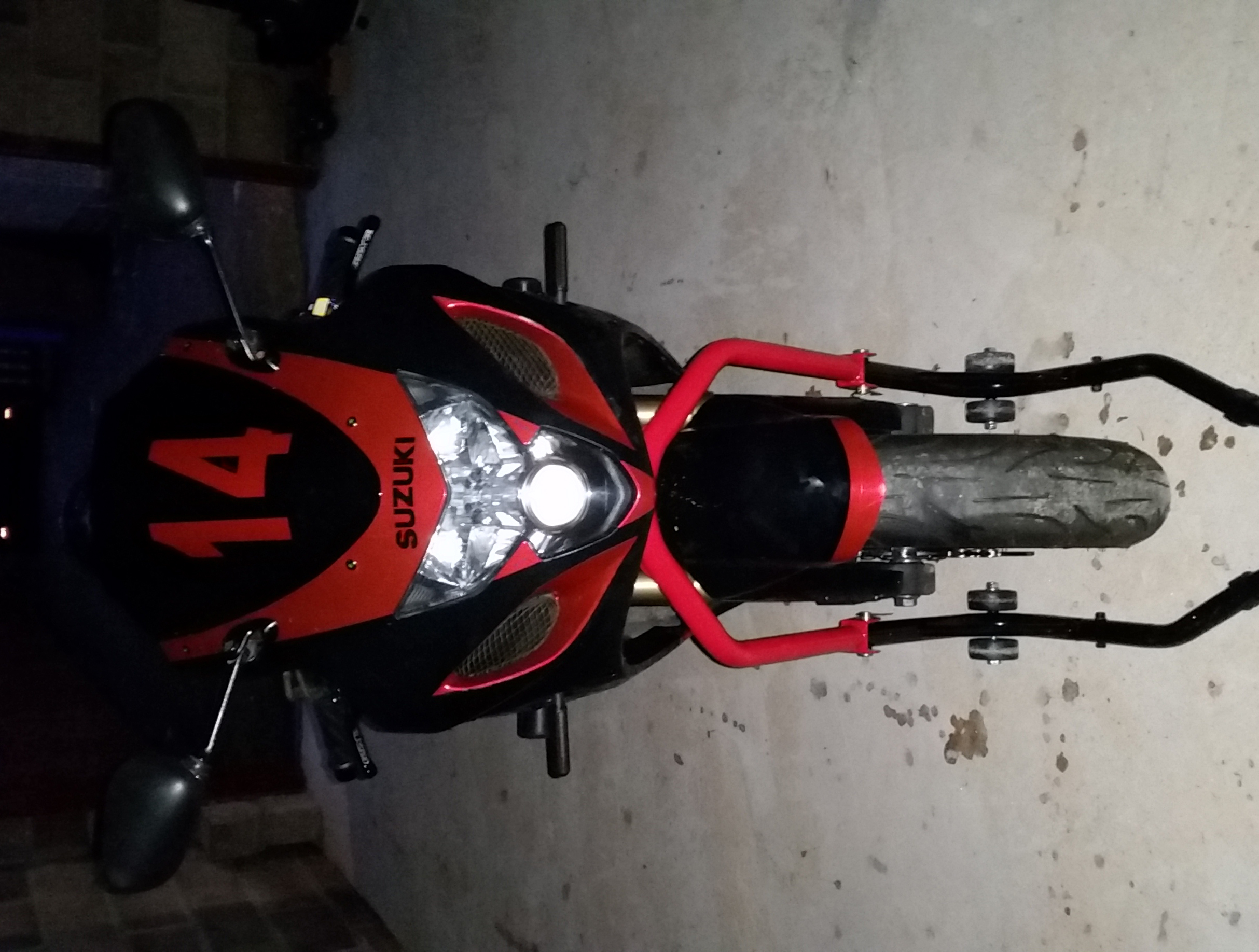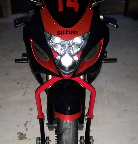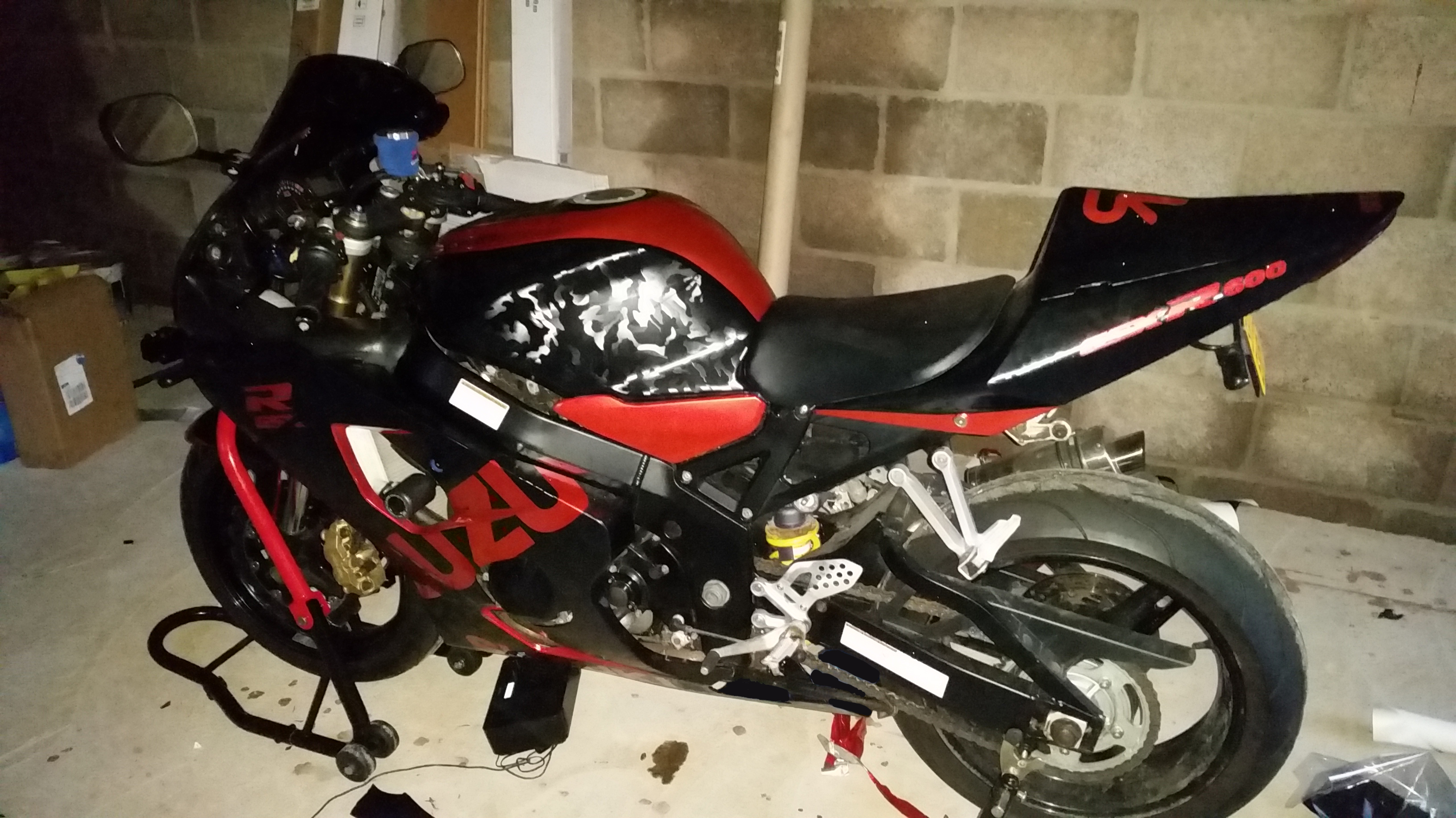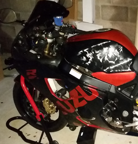 Bike wrapped in Stealth camo with chrome satin red accents and Sukuki livery.
