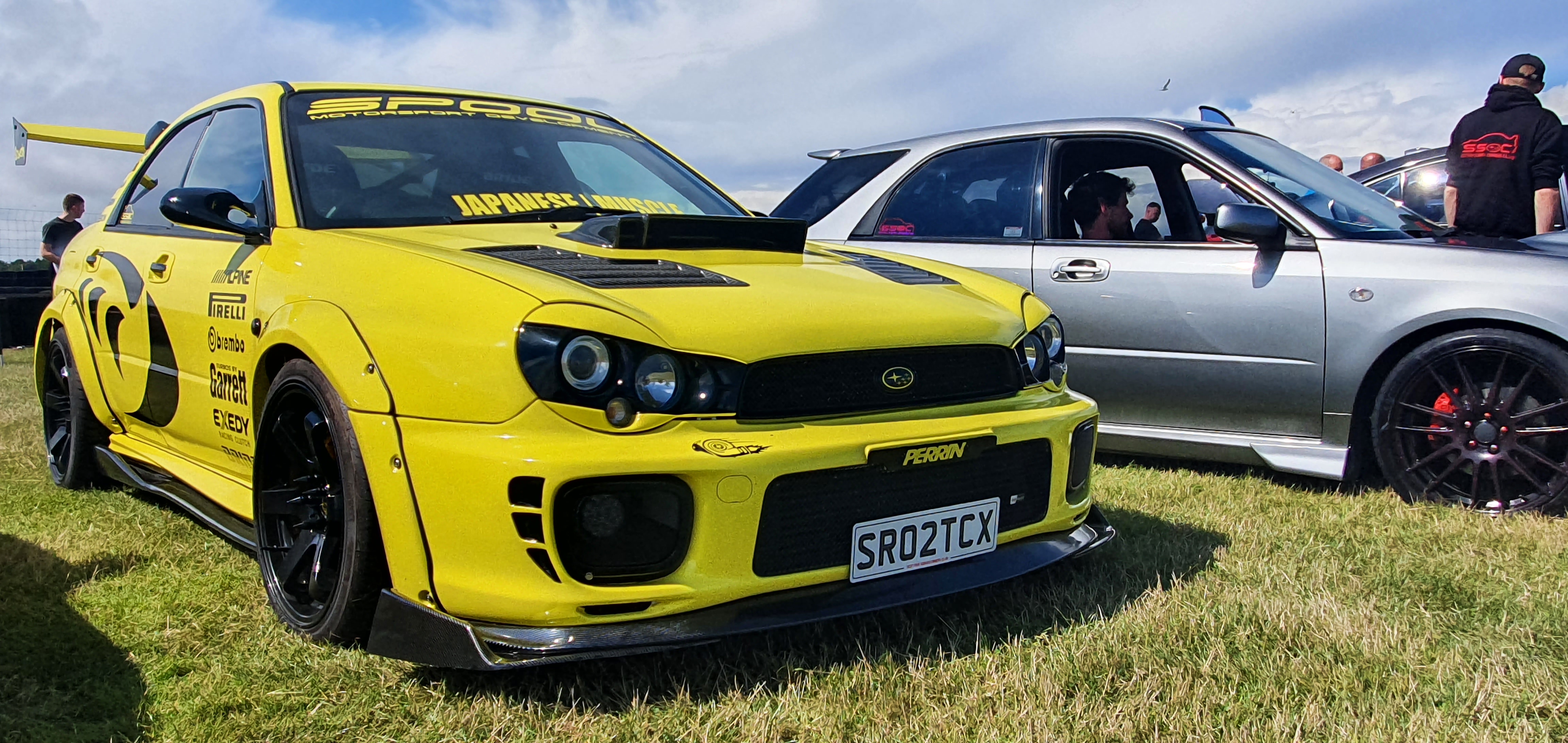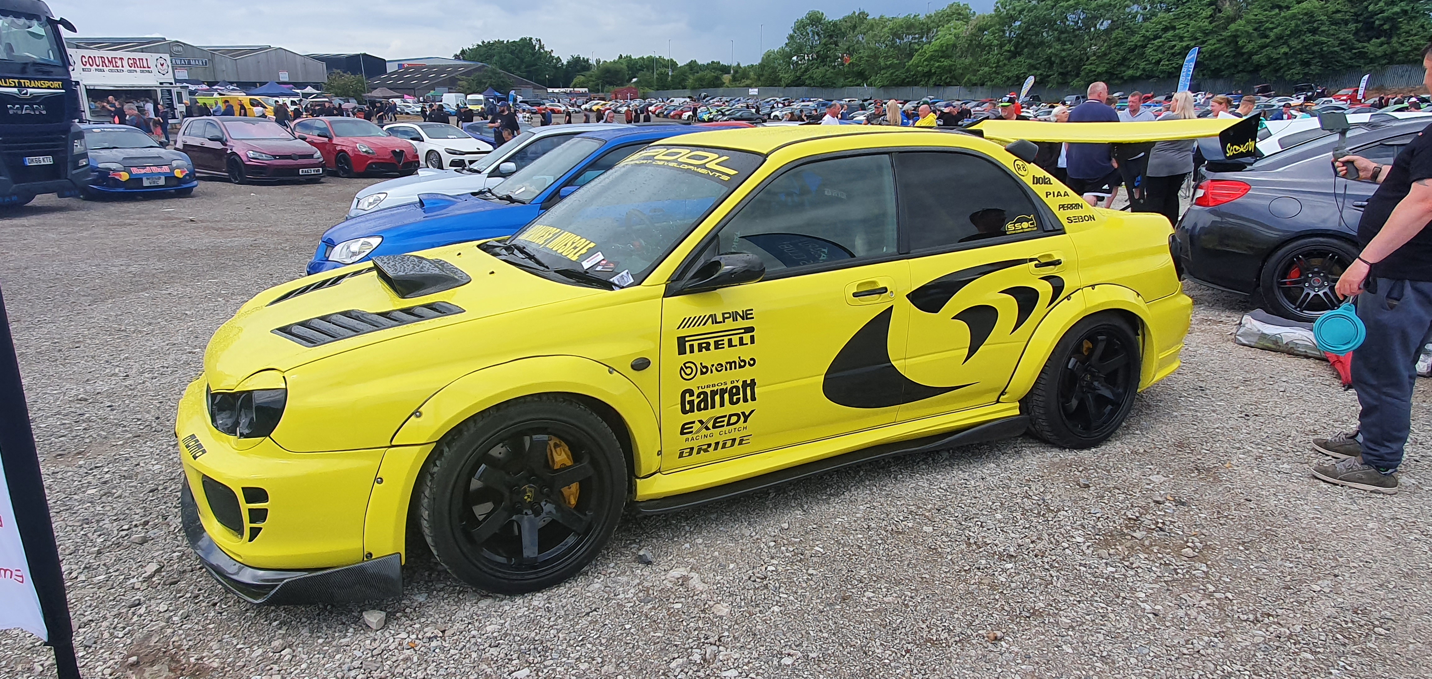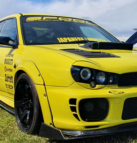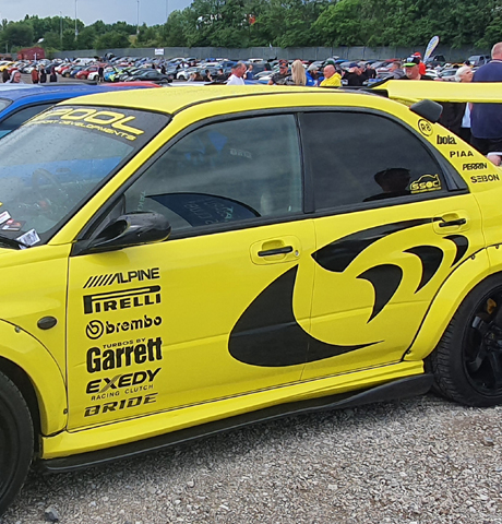 Subaru Impreza wrapped in Lemon Yellow with black subaru rally graphics and accents.
