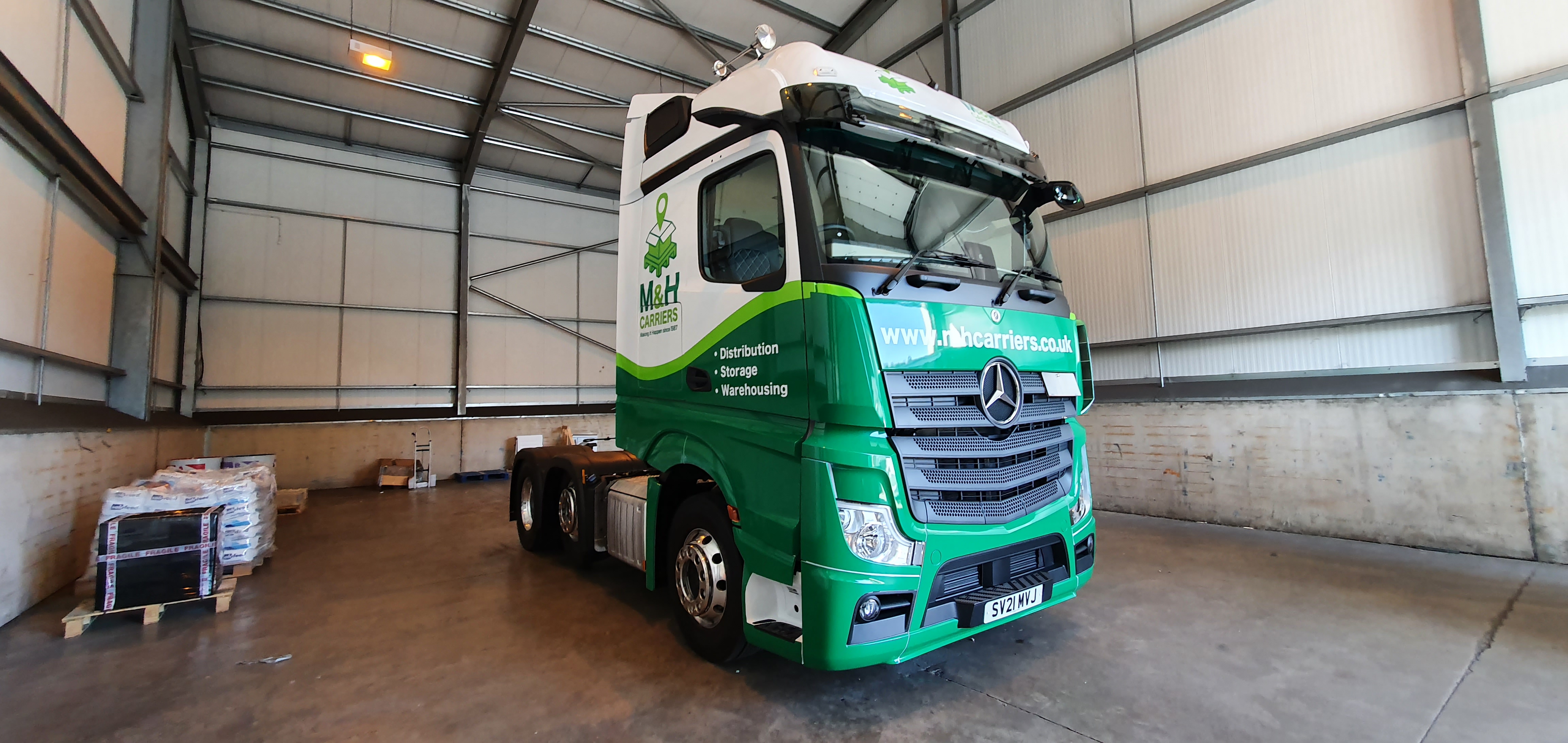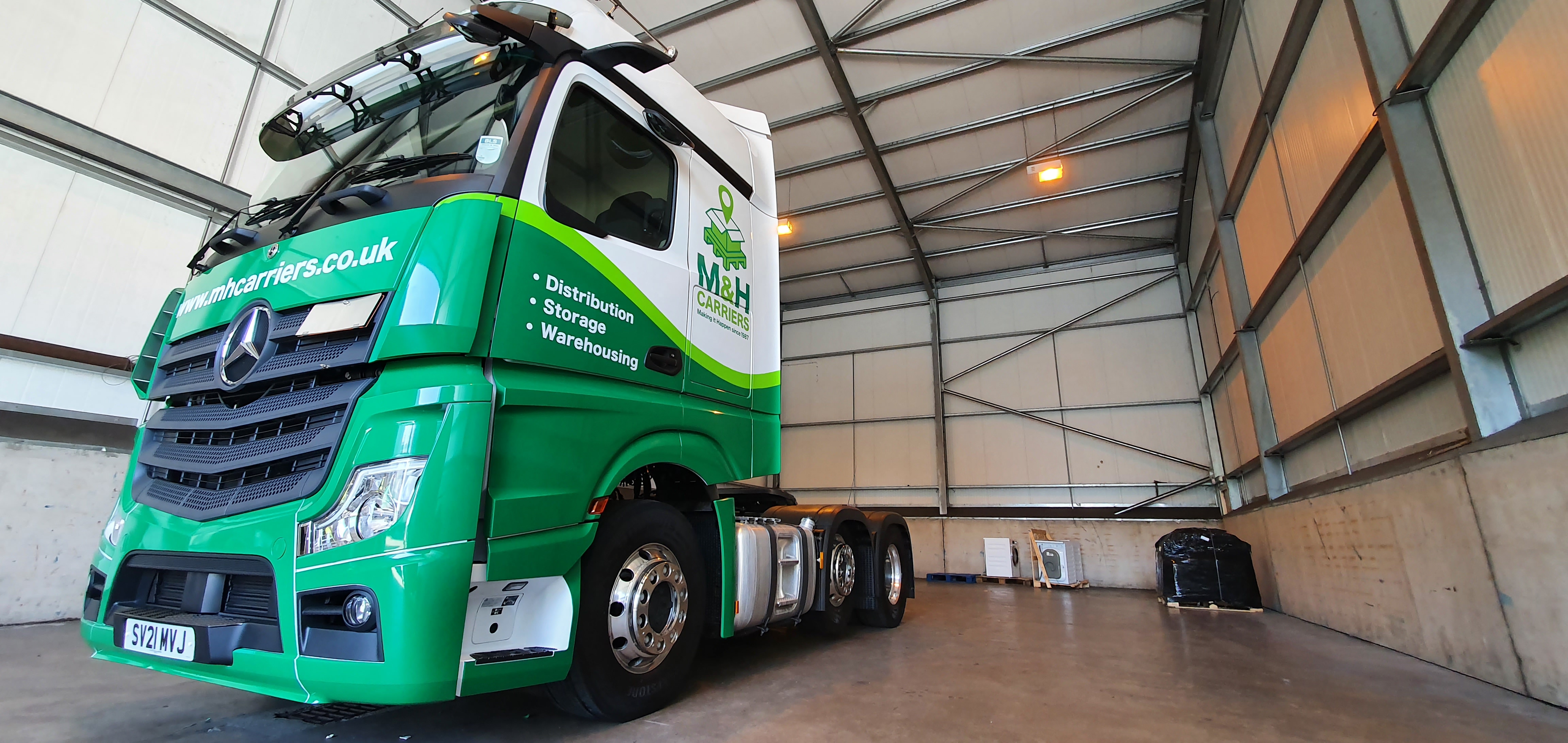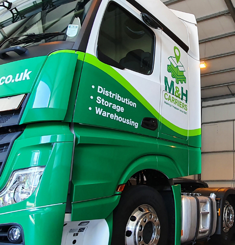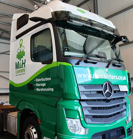 Artic lorry cab wrapped in companies colours with M&H Livery.