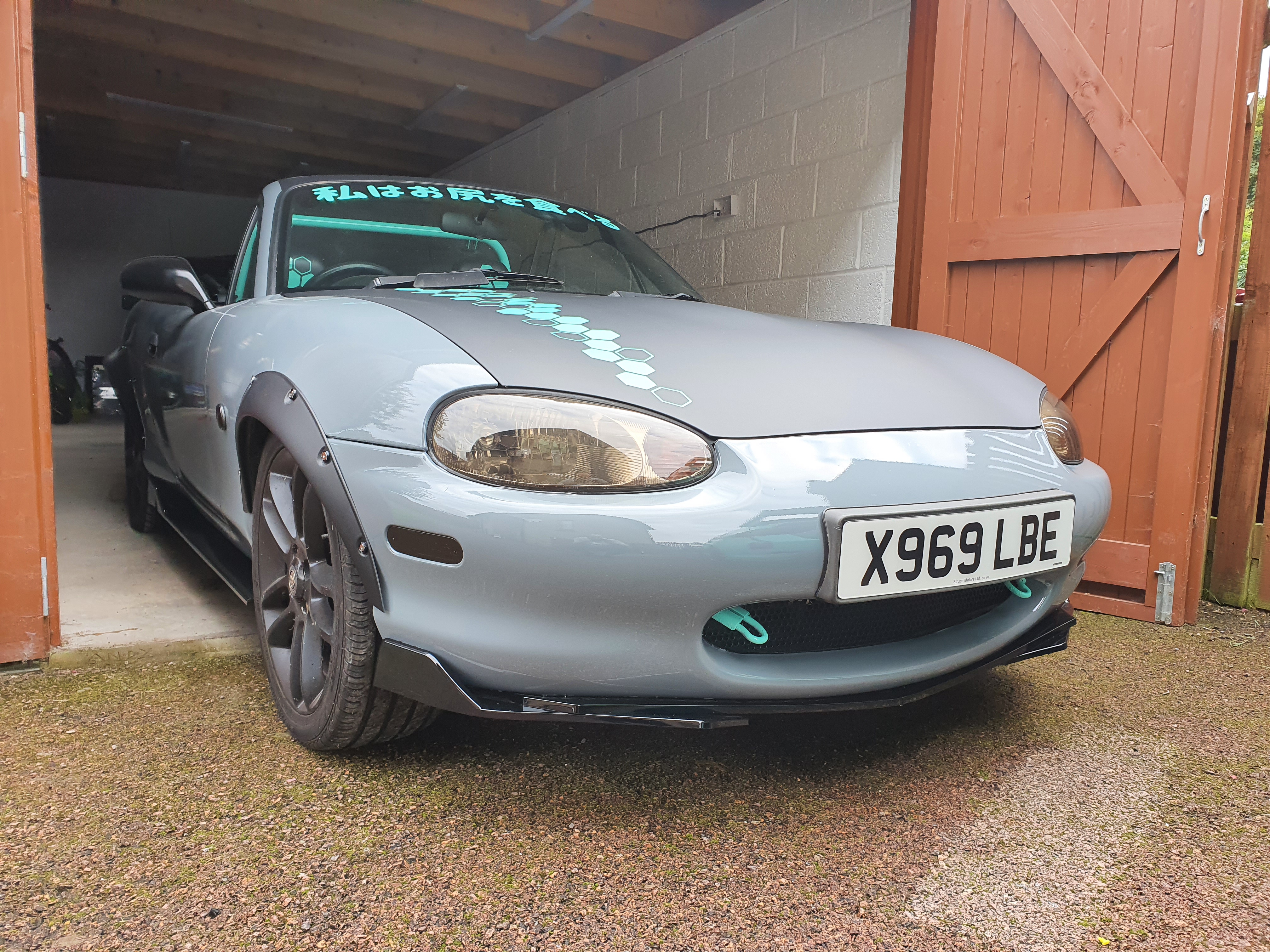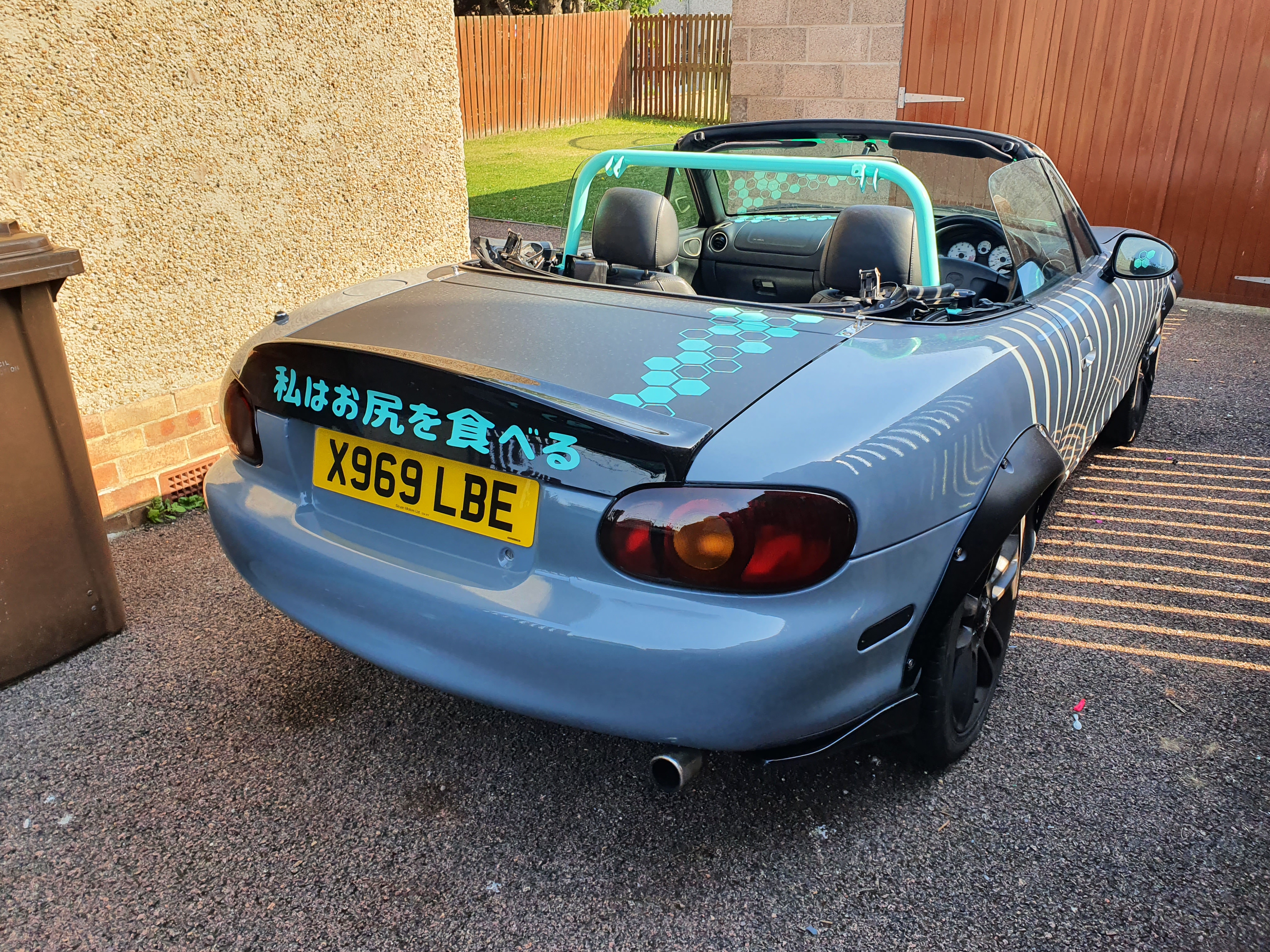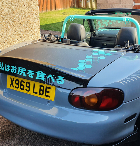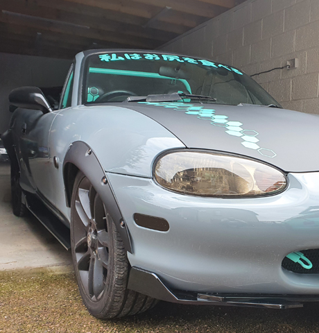 Mazda MX-5 wrapped in Nardo grey with matt black and tiffany accents, Hex cut patterns and japanese lettering.